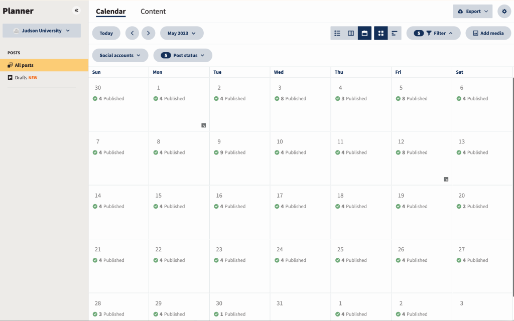 Hootsuite Schedule of posts for May 2023 – During the academic year, Judson posts almost daily. During the summer months, Judson posts three times a week.